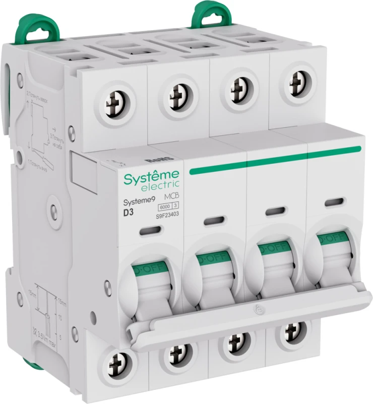 Автоматический выключатель S9FN, серии Systeme9, Systeme Electric, 4-полюсный, номинальный ток 3 А, характеристика D, Icn = 6 кА, Icu = 10 кА. Соответствует требованиям стандартов ГОСТ IEC 60898-1 и ГОСТ IEC 60947-2. Применяется в электрических сетях напряжением 400 В. Предназначен для защиты цепей от перегрузок и токов короткого замыкания. Оснащен двойными безопасными клеммами раздельного монтажа проводников, механизмом мгновенной коммутации, индикаторами состояния контактной группы и срабатывания по причине аварии. Монтируется на DIN-рейку при помощи двухпозиционных защёлок, с возможностью демонтажа без снятия шины PIN.