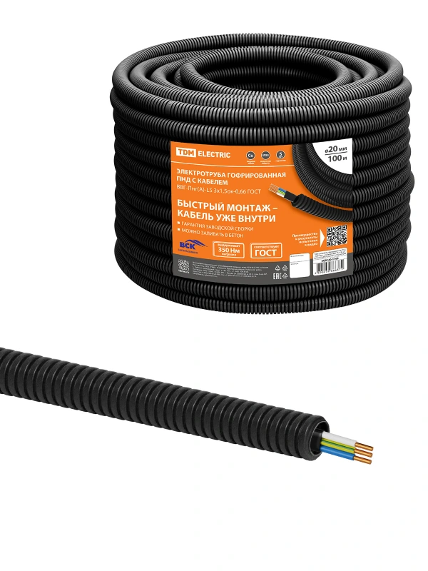 Электротруба гофрированная ПНД d20черн., с кабелем ВВГ-Пнг(А)-LS 3х1,5ок(N,PE)-0,66 ГОСТ (100 м) TDM