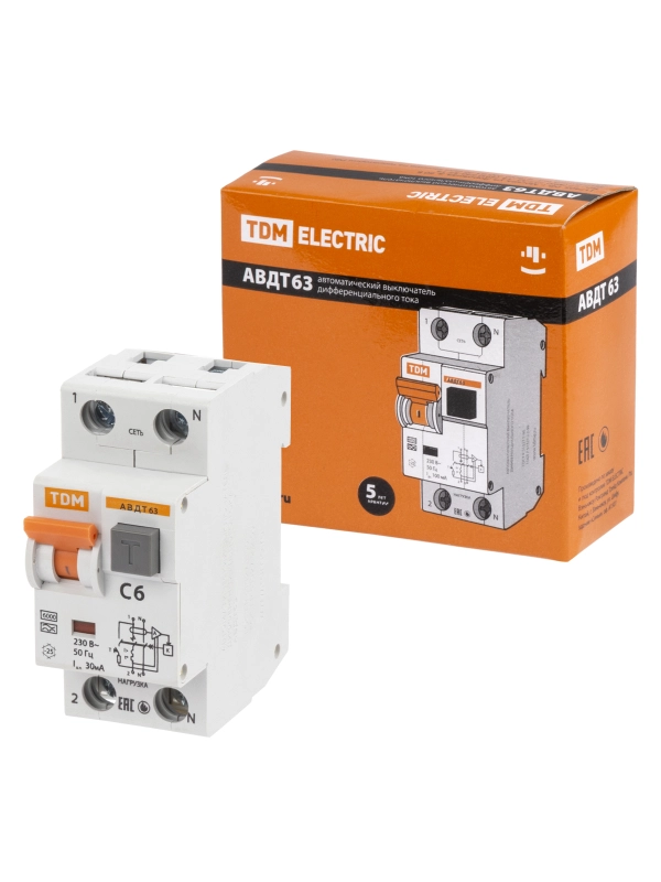 Дифференциальный автомат (АВДТ) TDM АВДТ 63 - 1P+N 6A (A) 30 mA Тип C 6 kA