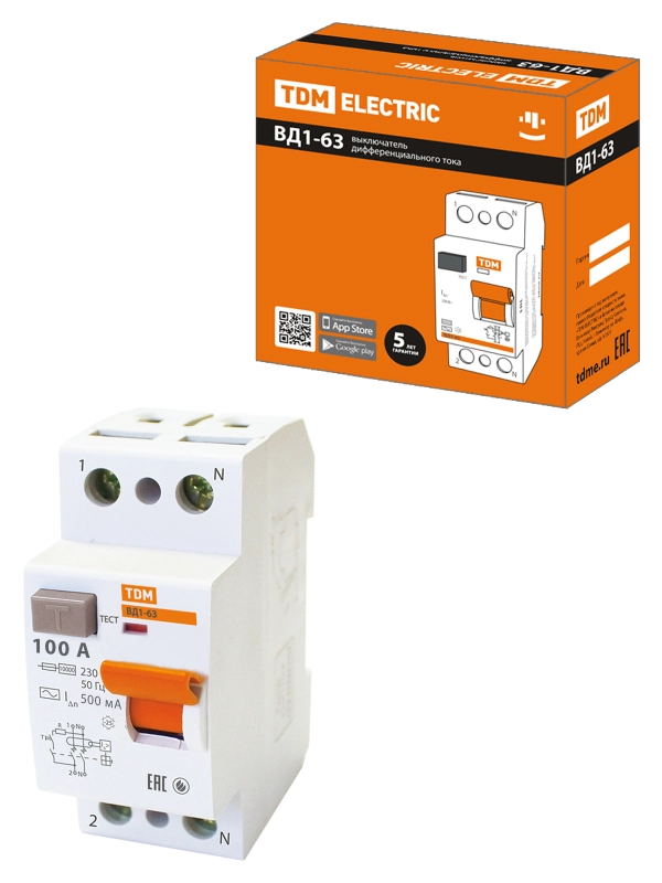 Устройство защитного отключения (УЗО/ВДТ) TDM ВД1-63 - 1P+N - 100A - AC - 500mA