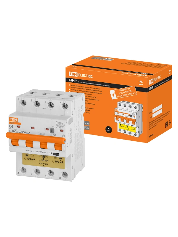 Диф.автомат АД4P 4Р С6 30-100-300мА 6кА тип АС TDM