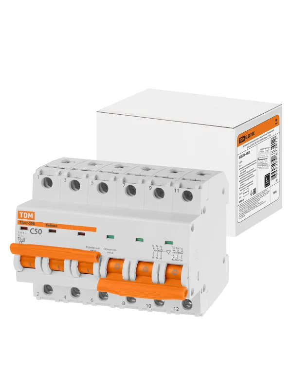 Авт. выкл. с мех. блок. (байпас) ВА47-29Б 3Р+3Р 50А 4,5кА х-ка C TDM