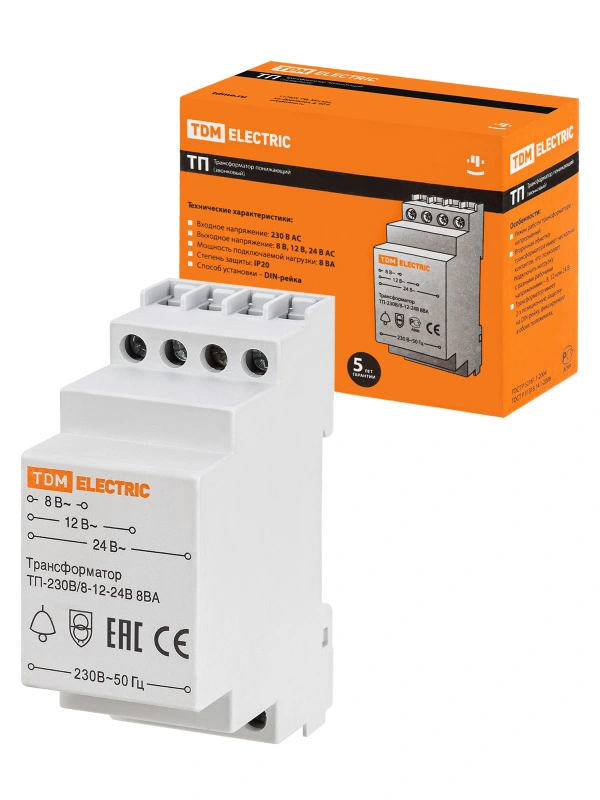 Трансформатор понижающий (звонковый) ТП-230В/8-12-24В 8ВА DIN-рейка TDM