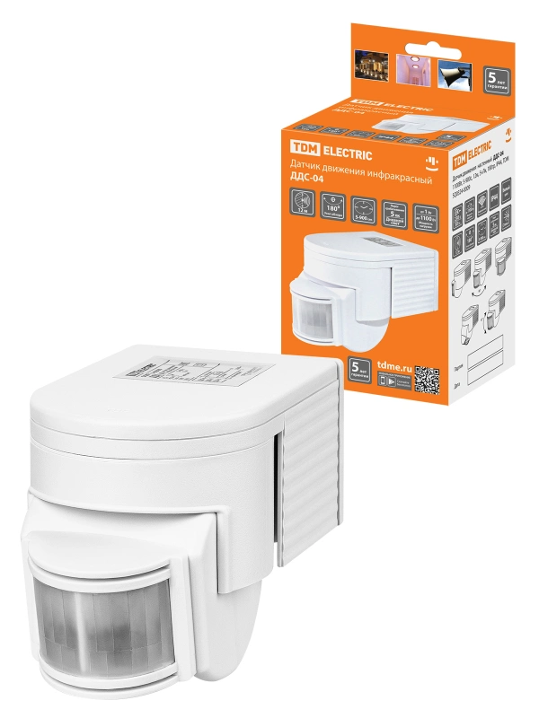 Датчик движения настенный ДДС-04 1100Вт, 5-480с, 12м, 5+Лк, 180гр, IP44, TDM