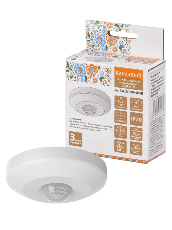 Датчик движения ДДП-Н-01 (100Вт, 10-420с, 6м, 10+Лк, 120(сбоку)+360(сверху)гр, IP20) "Народный"