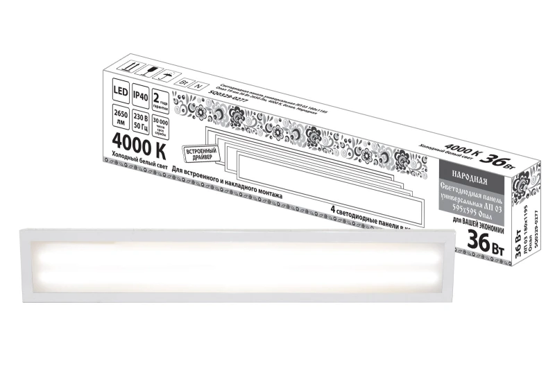 Светодиодная панель универсальная ЛП 03 180х1195 Опал 19 мм 36 Вт 2650 Лм, 4000 К, белая, Народная
