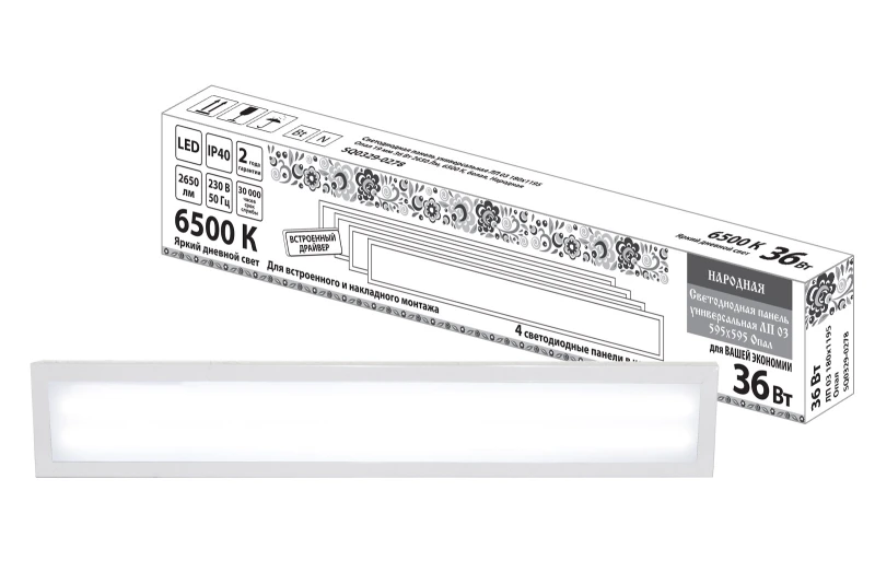 Светодиодная панель универсальная ЛП 03 180х1195 Опал 19 мм 36 Вт 2650 Лм, 6500 К, белая, Народная