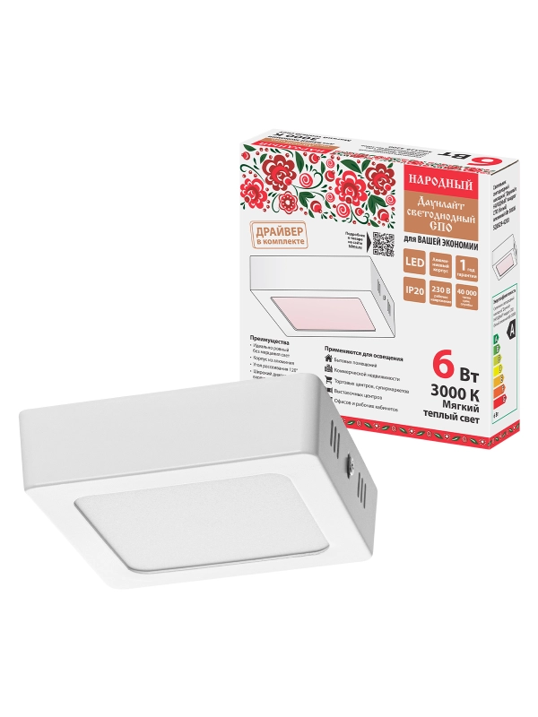 Светильник светодиодный накладной "Даунлайт НАРОДНЫЙ" квадрат СПО (белый) алюминий 6Вт 3000К