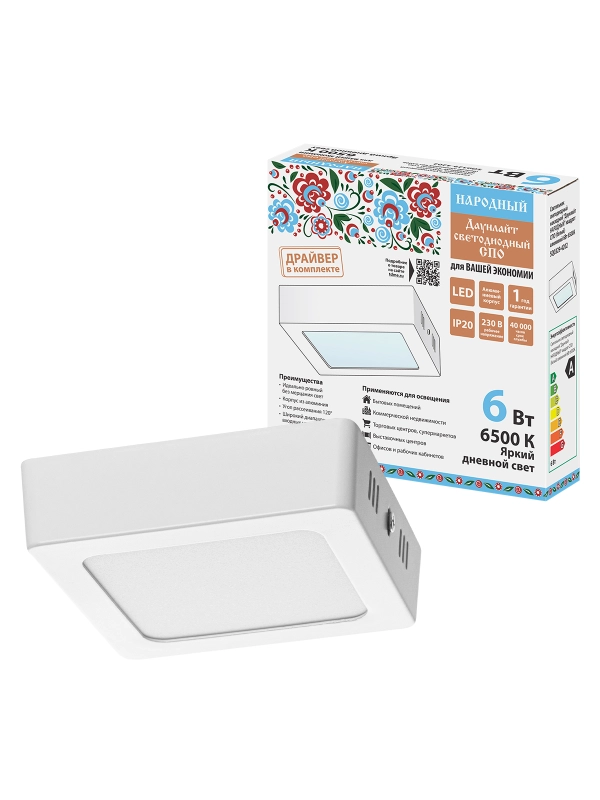 Светильник светодиодный накладной "Даунлайт НАРОДНЫЙ" квадрат СПО (белый) алюминий 6Вт 6500К
