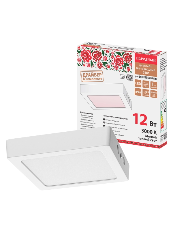 Светильник светодиодный накладной "Даунлайт НАРОДНЫЙ" квадрат СПО (белый) алюминий 12Вт 3000К
