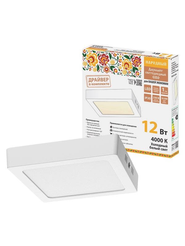 Светильник светодиодный накладной "Даунлайт НАРОДНЫЙ" квадрат СПО (белый) алюминий 12Вт 4000К