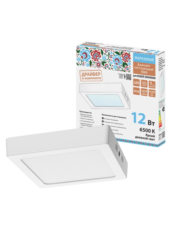 Светильник светодиодный накладной "Даунлайт НАРОДНЫЙ" квадрат СПО (белый) алюминий 12Вт 6500К