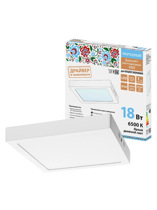 Светильник светодиодный накладной "Даунлайт НАРОДНЫЙ" квадрат СПО (белый) алюминий 18Вт 6500К