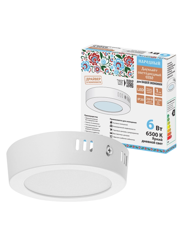 Светильник светодиодный накладной "Даунлайт НАРОДНЫЙ" круг СПО (белый) алюминий 6Вт 6500К