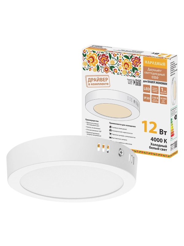 Светильник светодиодный накладной "Даунлайт НАРОДНЫЙ" круг СПО (белый) алюминий 12Вт 4000К