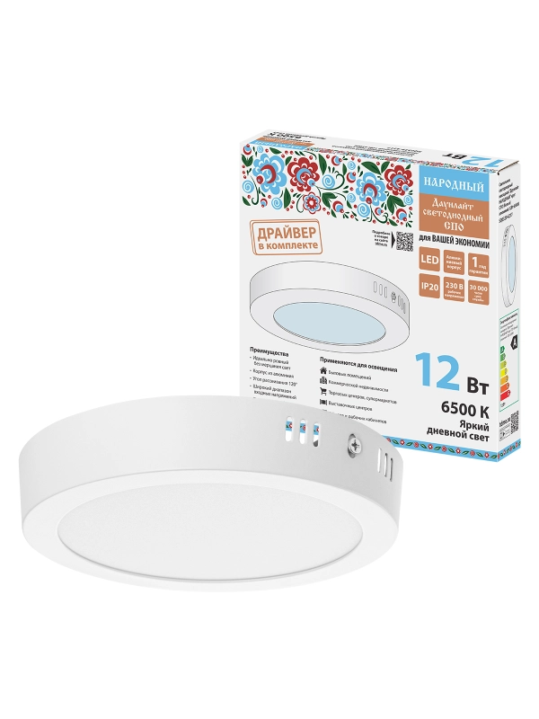 Светильник светодиодный накладной "Даунлайт НАРОДНЫЙ" круг СПО (белый) алюминий 12Вт 6500К