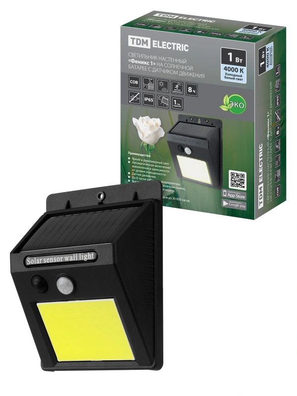 Светильник настенный "Феникс 1" на солн. батарее с датч. движ., 1 Вт, IP65, пластик, черн., TDM