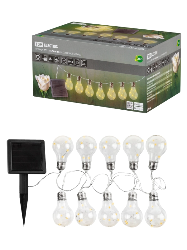 Гирлянда ССГ-110 "Лампы" на солнечной батарее, 1,3 м, 60 LED, теплый белый, IP44, TDM
