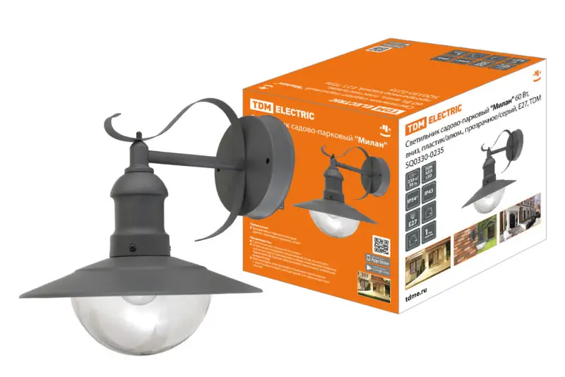 Светильник садово-парковый "Милан" 60 Вт, вниз, пластик/алюм., прозрачное/серый, Е27, TDM