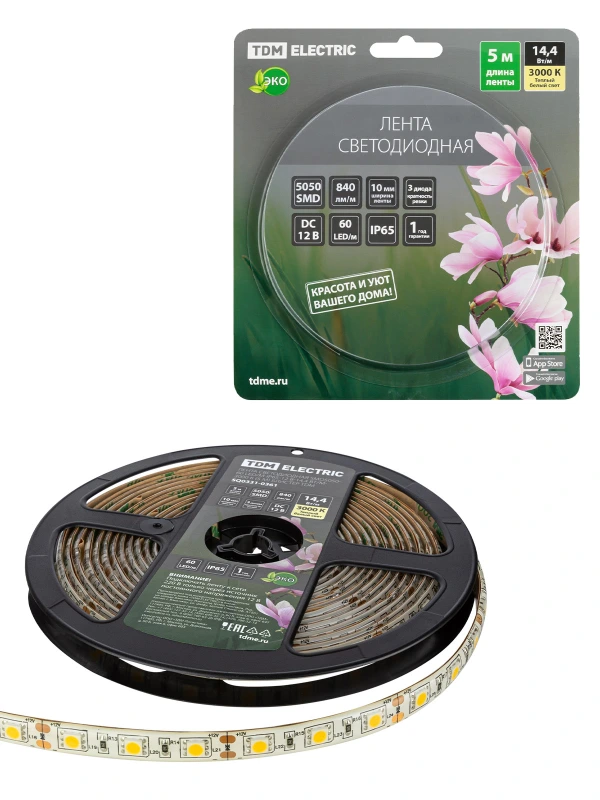 Лента светодиодная SMD5050-60 LED/м-IP65-12 В-14,4 Вт/м-3000 К (5 м) блистер TDM