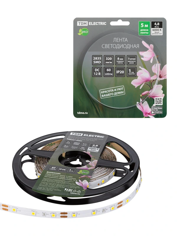 Лента светодиодная SMD2835-60 LED/м-IP20-12 В-4,8 Вт/м-6000 К (5 м) блистер TDM