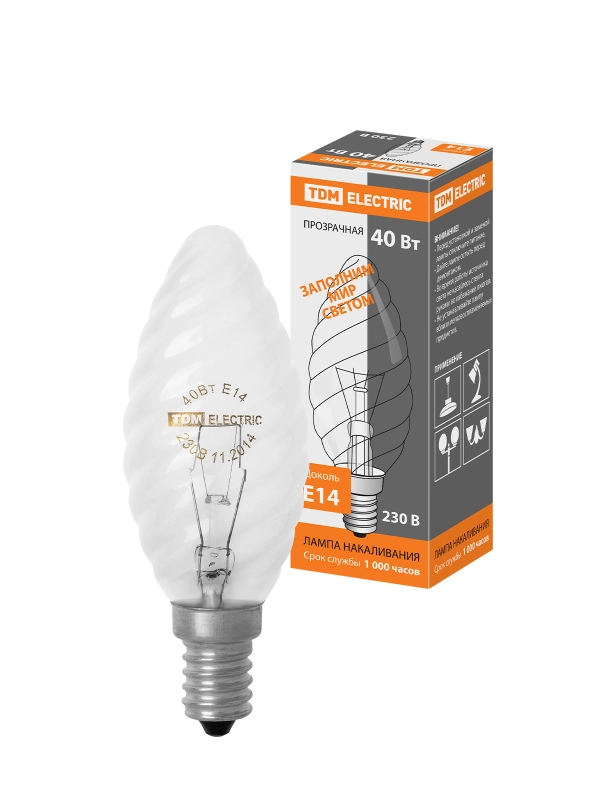 Лампа накаливания "Витая свеча" прозрачная 40 Вт-230 В-Е14 TDM