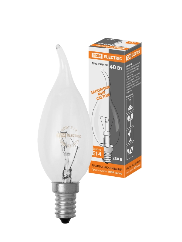Лампа накаливания "Свеча на ветру" прозрачная 40 Вт-230 В-Е14 TDM