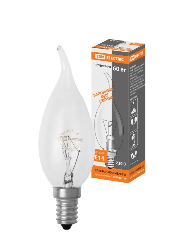 Лампа накаливания "Свеча на ветру" прозрачная 60 Вт-230 В-Е14 TDM