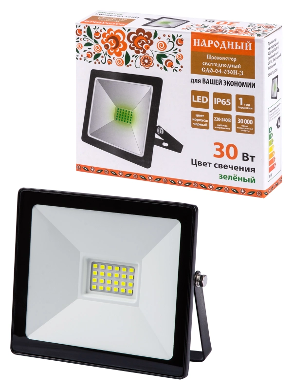 Прожектор светодиодный СДО-04-030Н-З (зелёный свет) 30 Вт, IP65, черный, Народный