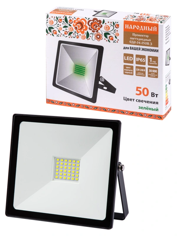 Прожектор светодиодный СДО-04-050Н-З (зелёный свет) 50 Вт, IP65, черный, Народный