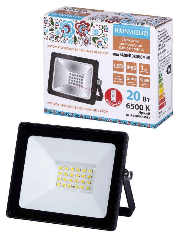 Прожектор светодиодный СДО-04-020Н-Ф (с фотореле) 20 Вт, 6500 К, IP65, черный, Народный