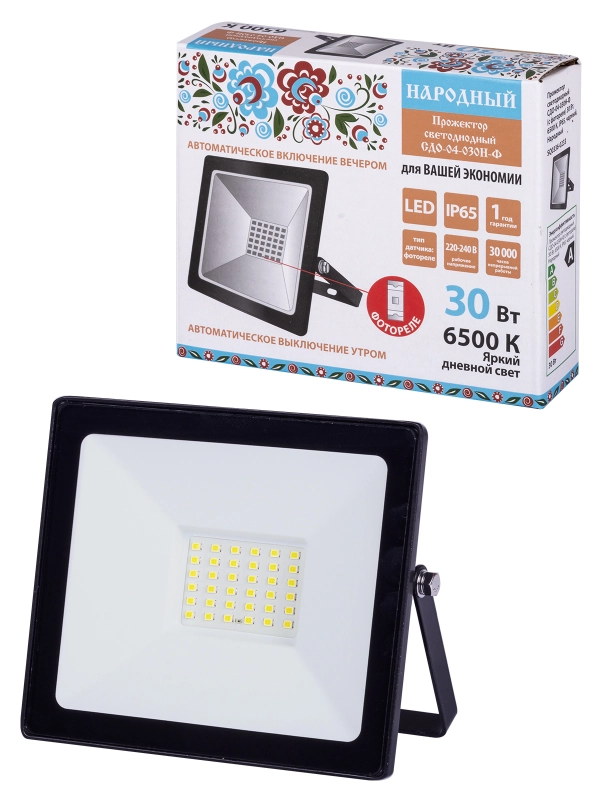 Прожектор светодиодный СДО-04-030Н-Ф (с фотореле) 30 Вт, 6500 К, IP65, черный, Народный