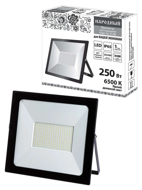 Прожектор светодиодный СДО-04-250Н 250 Вт, 6500 К, IP65, черный, Народный