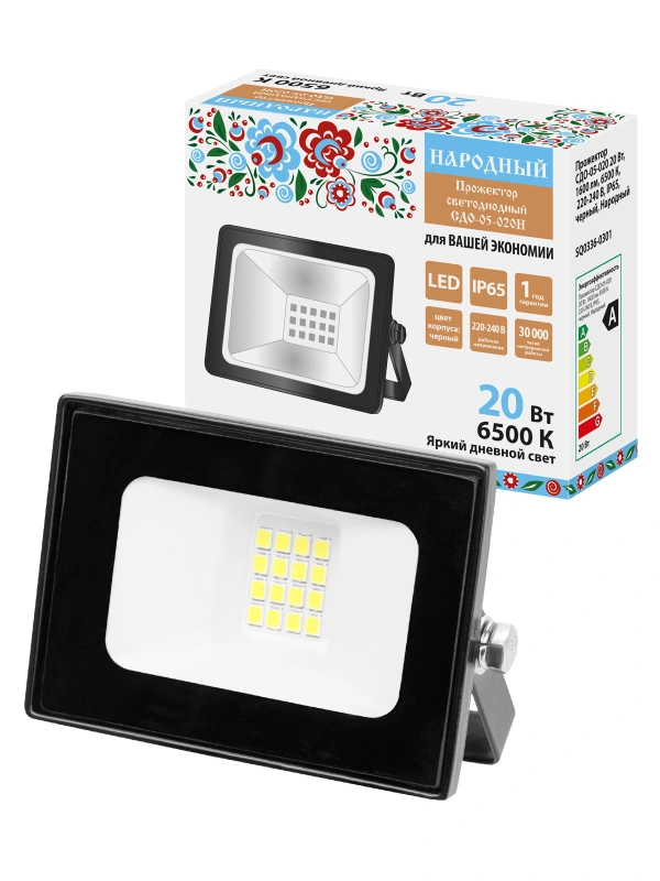 Прожектор СДО-05-020 20 Вт, 1600 лм, 6500 К, 220-240 В, IP65, черный, Народный