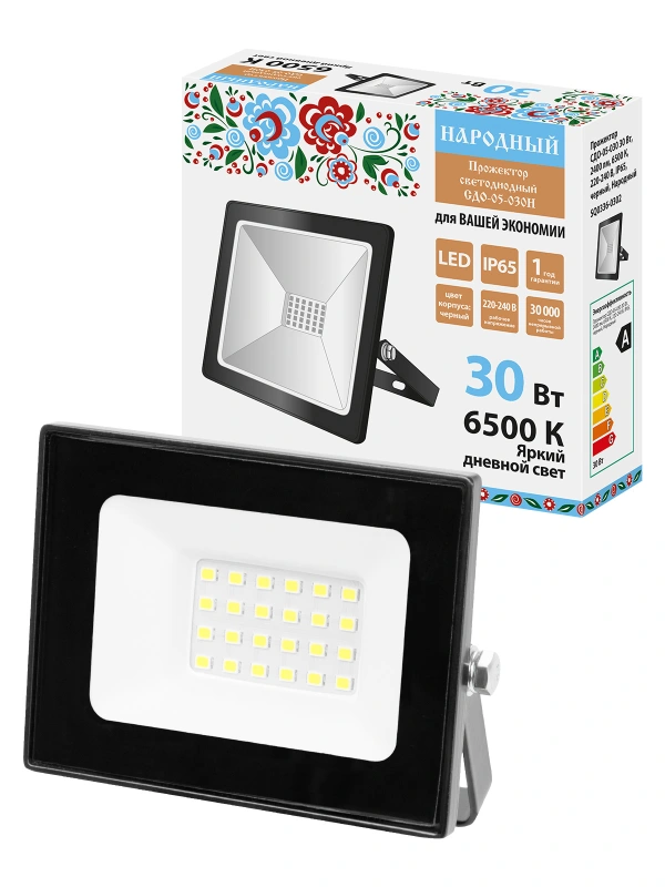 Прожектор СДО-05-030 30 Вт, 2400 лм, 6500 К, 220-240 В, IP65, черный, Народный