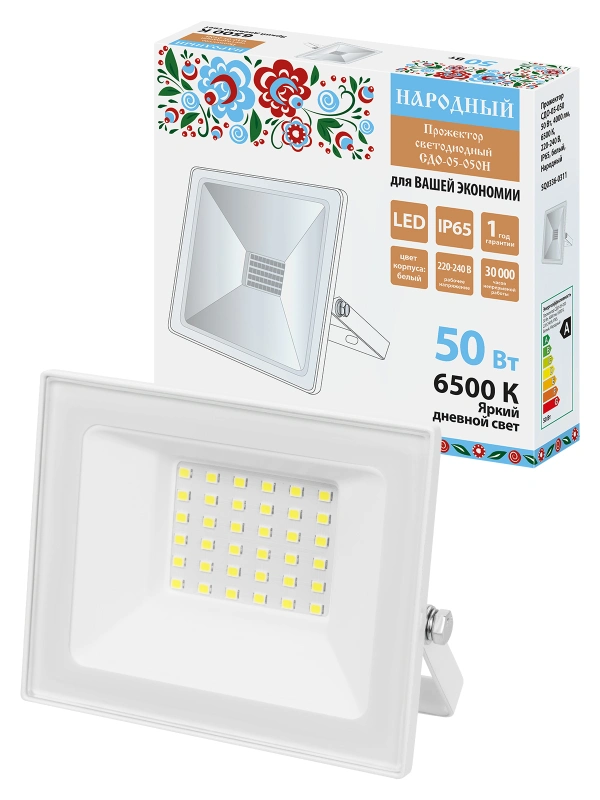Прожектор СДО-05-050 50 Вт, 4000 лм, 6500 К, 220-240 В, IP65, белый, Народный
