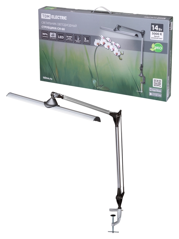 Светильник светодиодный струбцина СН-60, 2 колена, сенс-димм, 220 В, 14Вт, 5000 К, сереб-черн, TDM