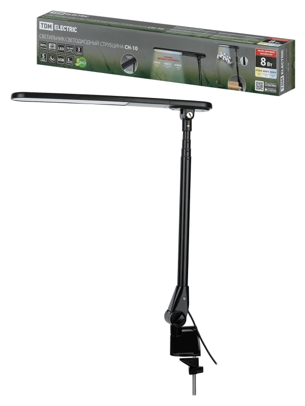 Светильник светодиодный струбцина СН-10, 8 Вт, телескопич., сенс-димм, 2700-6500 К, USB, черный, TDM