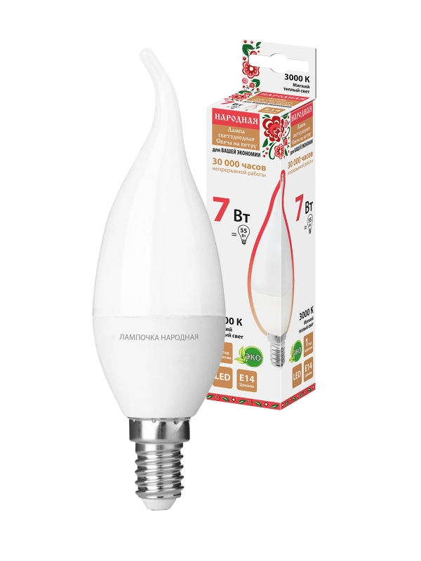 Лампа светодиодная WFC37-7 Вт-230 В -3000 К–E14 (свеча на ветру) Народная