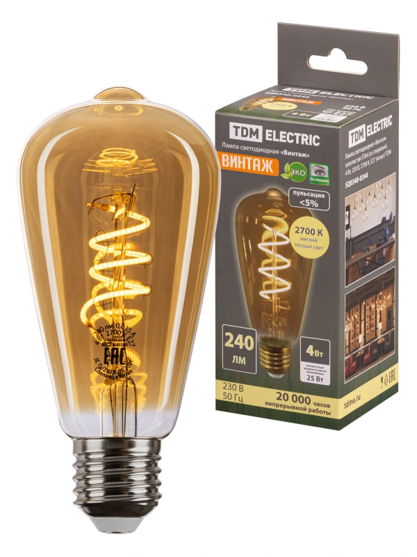 Лампа светодиодная «Винтаж» золотистая ST64 (со спиралью), 4 Вт, 230 В, 2700 К, E27 (конус) TDM