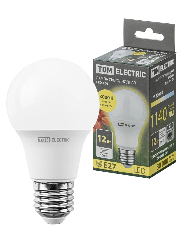 Лампа светодиодная А60 12 Вт, 230 В, 3000 К, E27 TDM