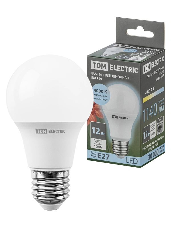 Лампа светодиодная А60 12 Вт, 230 В, 4000 К, E27 TDM