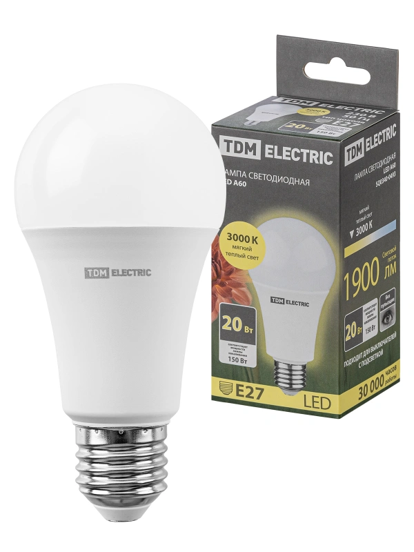 Лампа светодиодная А60 20 Вт, 230 В, 3000 К, E27 TDM