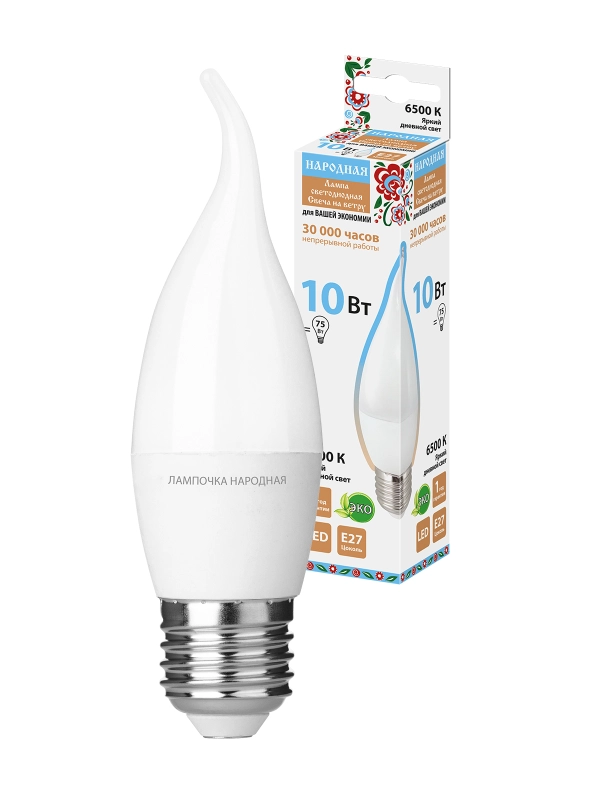 Лампа светодиодная WFС37-10 Вт-230 В -6500 К–E27 (свеча на ветру) Народная