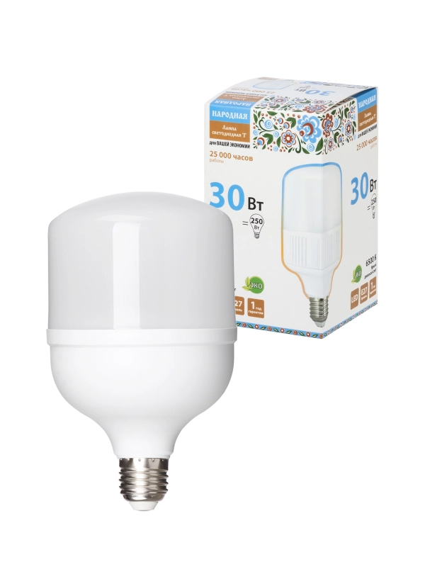 Лампа светодиодная T-30 Вт-230 В-6500 К–E27 (99x168 мм) НАРОДНАЯ