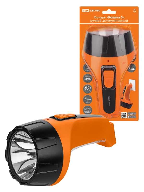 Фонарь «Комета 5» ручной аккумуляторный, 2 Вт 1 светодиод+10 SMD, 0,7 А*ч 230 В вилка, TDM