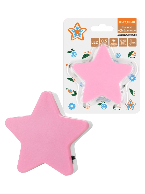 Ночник "Звездочка" с датчиком освещенности, 0,5 Вт, розовый,220 В Народный
