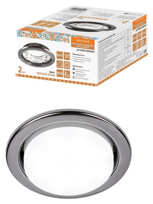 Светильник встраиваемый СВ 01-08 GX53 220 В 50 Гц, черный хром, 2 шт/уп, Народный