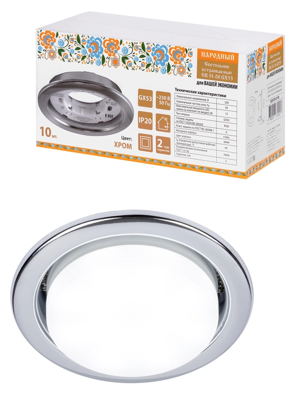 Светильник встраиваемый СВ 01-08 GX53 220 В 50 Гц, хром, 10 шт/уп, Народный