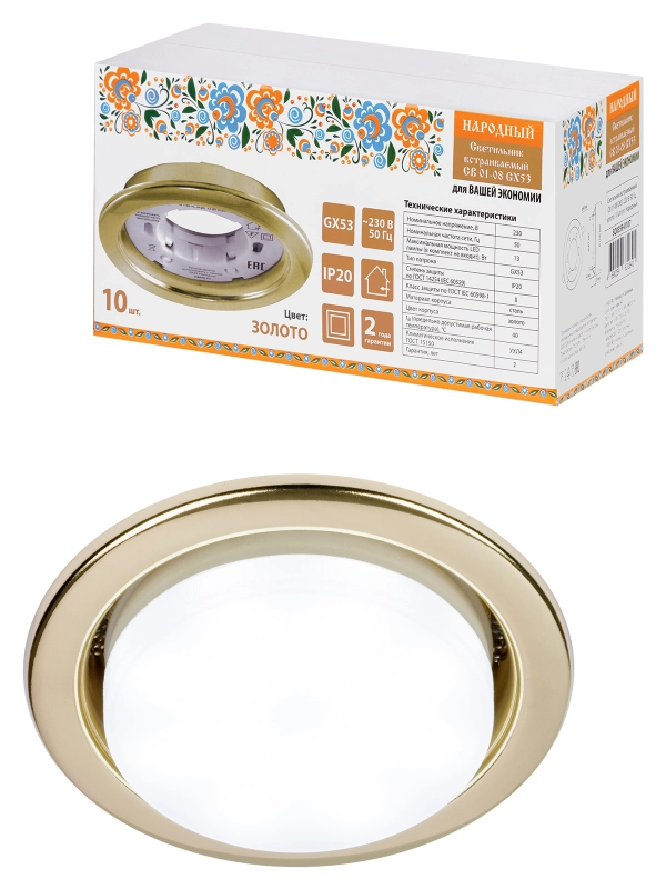 Светильник встраиваемый СВ 01-08 GX53 220 В 50 Гц, золото, 10 шт/уп, Народный